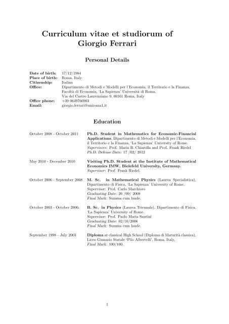 Curriculum Vitae Et Studiorum Of Giorgio Ferrari Memotef Sapienza
